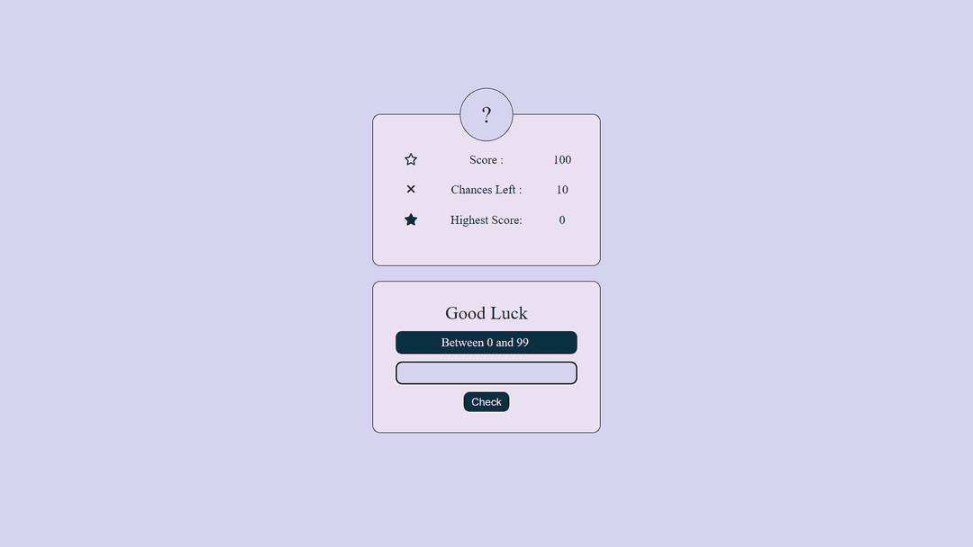 This is a simple number guessing game. The objective of the game is to guess a randomly generated number between 0 and 99 with the least possible number of attempts. The user can input a number and click the 'Check' button to see if it matches the randomly generated number. If the number is correct, the user wins the game, and their score is updated. If the number is incorrect, the user's score is reduced, and they have fewer attempts left.